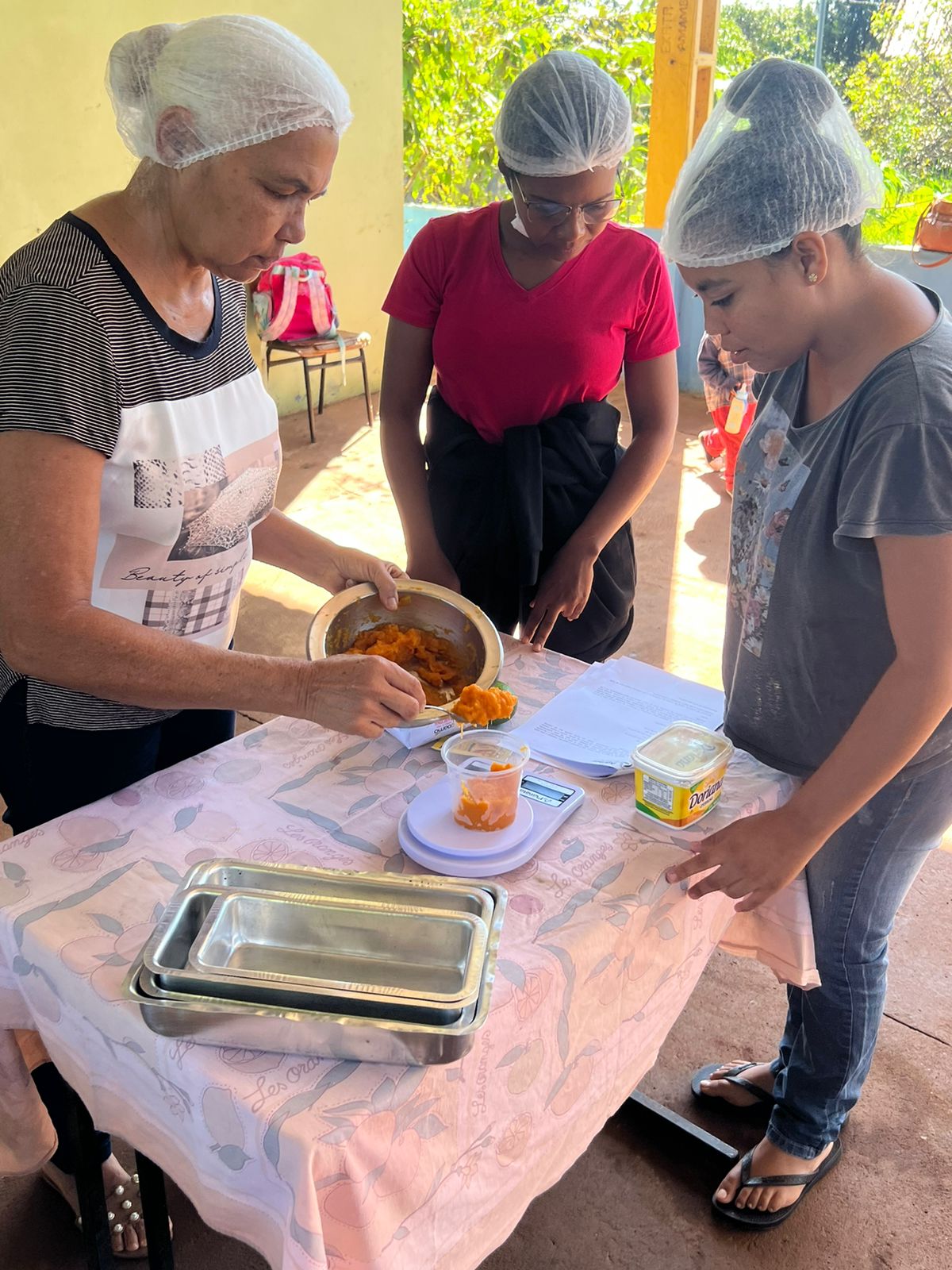 Os extensionistas rurais da Agência de Desenvolvimento Agrário e Extensão Rural (Agraer), vinculada à Semadesc, levaram um curso sobre produção de panificados enriquecidos com legumes e tubérculos ao Quilombo São Miguel, em Maracaju. A capacitação foi organizada pelo agrônomo do escritório local, Jerônimo Hillesheim, e ministrada pela economista doméstica do escritório da Agraer de Itaporã, Inês Monteiro Ortega, e pela nutricionista do setor de Agroindústria e Compras Públicas, Maria Tainara.